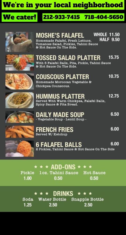Nestled in the heart of New York City at 94 W 46th St, Moshe’s Falafel is a culinary gem that brings authentic Israeli flavors to life. The menu boasts a delightful array of dishes, with the highlight being the falafel—crispy, flavorful, and beautifully complemented by homemade tahini sauce. Each falafel sandwich features six generous balls, packed with spices, served on warm pita with fresh tomatoes, lettuce, and pickles.